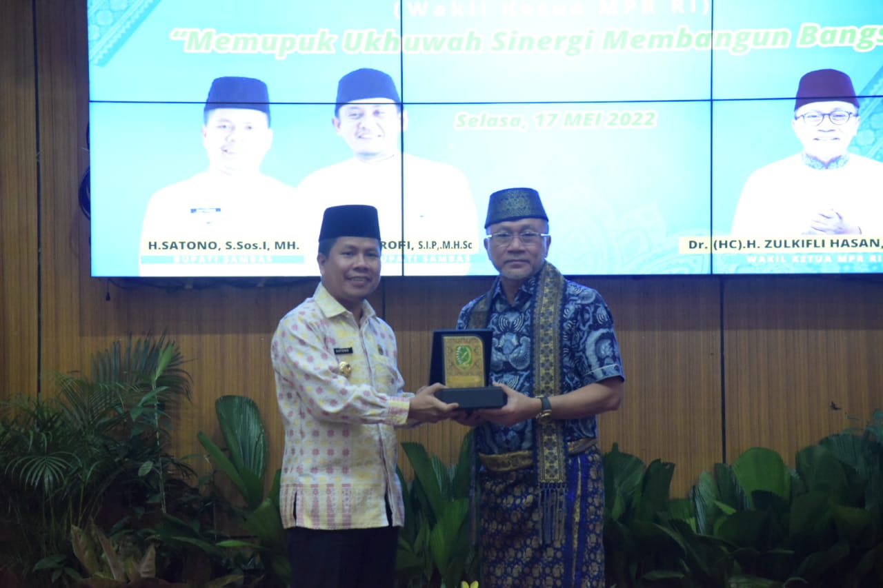 FOTO - Bupati Sambas, H. Satono, S.Sos.I., M.H., menerima kunjungan kerja Wakil Ketua MPR RI, Zulkifli Hasan dalam rangka memberikan kuliah kebangsaan dalam acara silaturahmi idul fitri 1443 H / 2022 di Aula Kantor Bupati Sambas, Selasa 17 Mei 2022. (HUMAS)