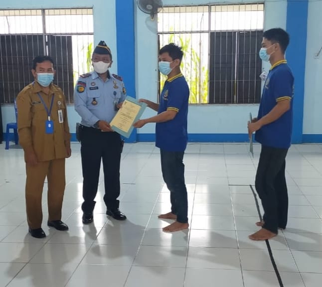 Bertempat di Aula Saharjo Rutan Kelas IIb Sambas kegiatan penyerahan sertifikat pelatihan bagi warga binaan pemasyarakatan (WBP). Selasa 17 Mei 2022.
