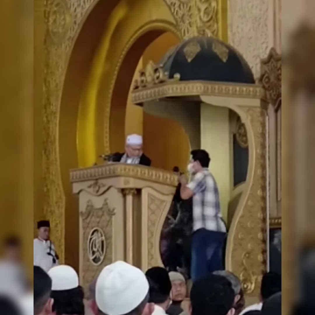 Hal itu, sontak membuat khotib berhenti khotbah. Serta terlihat beberapa jemaah berusaha mengamankan aksi perempuanyang tak diketahui identitasnya tersebut.